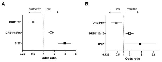 EBV− cHL patients carrying the HLA-DRB1*15/16 risk allele more frequently retained HLA class II expression (69% vs. 52%, p = 0.007), consistent with our hypothesis (Figure 2A,B). No significant differences were observed for patients carrying the risk alleles HLA-B*07 and HLA-DRB1*11/12.