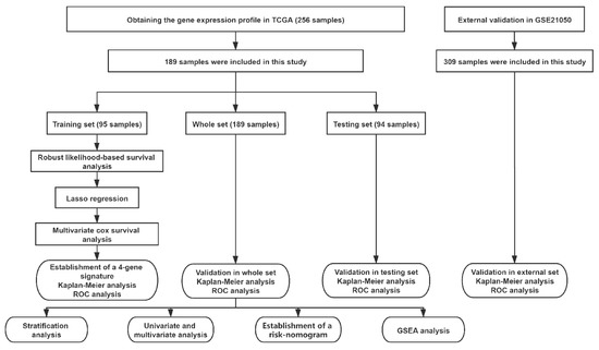 For this study patients were divided into a training set (n = 95) and a testing set (n = 94) by random assignment. In the training set, a robust likelihood-based survival analysis was performed using the package “rbsurv” in the R software (Version 4.0.3, R Foundation for Statistical Computing, Vienna, Austria) to identify genes related to OS [19]. After 10 iterations, 22 prognostic-related genes were obtained. Then, the R packages “glmnet” and “survival” were used to perform LASSO model analysis and multivariate Cox regression analysis and determined a survival-related prognostic model under the threshold of p < 0.05. In addition, the “survminer” and “survival” R packages were used to find the best cut-off value to classify samples into high and low risk groups. The Kaplan–Meier curve was used to estimate the difference in OS and RFS between the two groups and used the R package “timeROC” to plot the receiver operating characteristic (ROC) curve over time to assess the predictive value of this prognostic gene signature. Finally, the predictive value of prognostic gene signatures was verified in the testing set and the whole set.