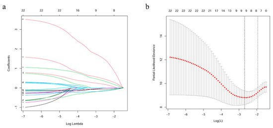 Identification of 22 survival-related genes by LASSO regression. (a) LASSO coefficient profiles of 22 prognostic genes. (b) Ten-time cross-validation for tuning parameter selection in the LASSO model.
