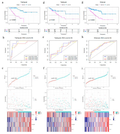 Analysis of OS for the four-gene signature in STS. (a–c) Kaplan–Meier curve, time-dependent ROC analysis, risk score, survival status and heatmap of mRNA expression of the four-gene signature in the training set. (d–f) Kaplan–Meier curve, time-dependent ROC analysis, risk score, survival status and heatmap of mRNA expression of the four-gene signature in the testing set. (g–i) Kaplan–Meier curve, time-dependent ROC analysis, risk score, survival status and heatmap of mRNA expression of the four-gene signature in the whole set of TCGA cohort. Significance for survival analysis was calculated using a log-rank test, with the red line representing the 4GS-high-risk group and the blue line representing the low-risk group. Red in the heatmap represents high expression and blue represents low expression.