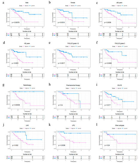 The R package “survminer” and “survival” were used to find the best cut-off value for the risk score to divide patients into 4GS-high-risk and 4GS-low-risk groups, and we performed the same operations on the testing set and the whole set. In the training set, the Kaplan–Meier curve showed that the OS of the 4GS-high-risk group was significantly shorter than that of the low-risk group (p < 0.0001) (Figure 3a). In addition, the ROC curve showed that the area under the curves (AUC) for 1-, 3- and 5-year OS were 0.942, 0.916, and 0.856, respectively (Figure 3b). In Figure 3c, we analysed the risk score distribution, survival status distribution and four-genes expression distribution of patients in the training set. The heatmap showed that the expression of DHRS3 was lower in the high-risk group, while the expression of JRK, TARDBP and TTC3 were obviously higher. We obtained similar results in the testing set and the whole set. In the testing set and the whole set, the high-risk groups had both shorter OS (p = 0.021 & p < 0.0001) (Figure 3d,g). The AUCs of 1-, 3-, and 5-year OS were 0.657, 0.660, 0.675 in the testing set, and 0.753, 0.762, 0.761 in the whole set (Figure 3e,h). The risk score distribution, survival status distribution and four genes expression distribution of patients are shown in Figure 3f,i, respectively. For the whole set, a data stratification analysis was also conducted. These patients were stratified according to different clinical parameters, such as gender, age (≤60 years/>60 years), Fédération Nationale des Centres de Lutte Contre le Cancer (FNCLCC) grade (grade 1&2/grade 3), radiotherapy, pharmaceutical therapy, histological type (DDLPS/LMS/UPS/other subtypes), tumour size (≤10 cm/>10 cm) and site of tumour. The results of stratified analysis showed that in patients of different age groups, gender, FNCLCC grade groups, and tumour size groups, the 4GS-high-risk groups all had lower OS (all p < 0.05) (Figure 4a–f and Supplementary Figure S3a,b). For patients who had undergone radiotherapy, the 4GS-high-risk group also had significantly shorter OS (p = 0.00038) (Figure 4g). Among patients who had undergone pharmaceutical therapy, there was no statistical difference between 4GS-high-risk patients and low-risk patients due to the small sample size of the low-risk group (Figure 3h). For patients with DDLPS, LMS and UPS, 4GS-high-risk patients also all had shorter OS than low-risk patients (all p < 0.05) (Figure 4i–k). In other subtypes, there was no statistical difference due to the small sample size of 4GS-low-risk patients (Figure 4l). Additionally, for patients with a tumour in retroperitoneum, upper/lower extremity and other site, 4GS-high-risk patients had shorter OS (all p < 0.05) (Supplementary Figure S3c,d,f). Patients with a tumour in superficial trunk, 4GS-high-risk patients also had shorter OS but no statistical difference due to the sample size limitation (Supplementary Figure S3e). Overall, our results indicated that the four-gene signature performed well in OS prediction.