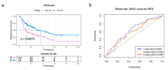 Kaplan–Meier analysis and time-dependent ROC analysis of RFS for the four-gene signature in STS. (a) Kaplan–Meier curve in the whole set. The significance was calculated using a log-rank test, with the red line representing the high-risk group and the blue line representing the low-risk group. The grouping of STS samples is shown at the bottom of the charts. (b) Time-dependent ROC curve in the whole set (AUC: 0.647, 0.584, and 0.595; 1, 2, and 5 years RFS).