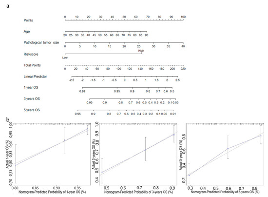 Nomogram predicting OS for STS patients. (a) The nomogram for predicting probabilities of patients with 1-, 3-, and 5-year OS. (b) The calibration plot for internal validation of the nomogram. The Y-axis represents actual survival, and the X-axis represents nomogram-predicted survival. The dashed diagonal line represents the ideal nomogram.