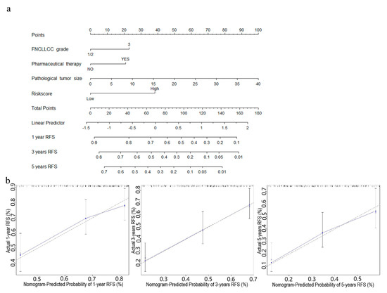 Nomogram predicting RFS for STS patients. (a) The nomogram for predicting probabilities of patients with 1-, 3-, and 5-year RFS. (b) The calibration plot for internal validation of the nomogram. The Y-axis represents actual survival, and the X-axis represents nomogram-predicted survival. The dashed diagonal line represents the ideal nomogram.