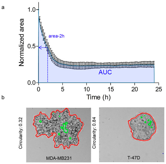 Determination of the quantitative parameters of anchorage-independent cancer cell aggregation dynamics. (a) Definition of the parameters extracted from the average aggregation curves of the normalized area. Each value of the normalized area, measured every 15 min, is the mean of 3–5 independent experiments with error bars. The area-2h is the area at 2 h and AUC is the area under the curve. (b) Micrographs: determination of the aggregate circularity after 24 h using an automated image analysis procedure. The red line shows the contours of the aggregate and the green color marks areas without cells. MDA-MB-231 (left) and T-47D (right) cells are shown as examples of circularity variations after 24 h. The circularity values are indicated on the side of the micrographs.