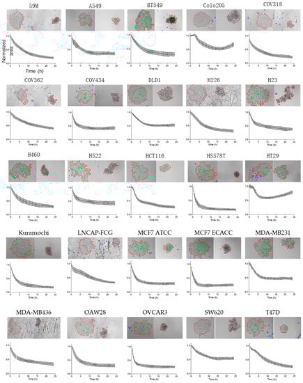In this study, we used this assay to test 25 cancer cell lines of various origins (Table S1). As illustrated by the micrographs taken at time 0 (initiation of cell aggregation) and at 24 h (Figure 2), cell aggregation was heterogeneous in the tested cancer cell lines, and did not always result in the formation of circular aggregates that will form a compact structure. This difference in aggregation capacity among cancer cell lines was also reflected in the curves representing the decrease in the relative area during the aggregation test (Figure 2). Moreover, these curves (obtained from 25 to 48 replicates for each cell line using data from three to five independent experiments) confirmed that this variability was not the result of a single observation, but of the intrinsic properties of each cell line.