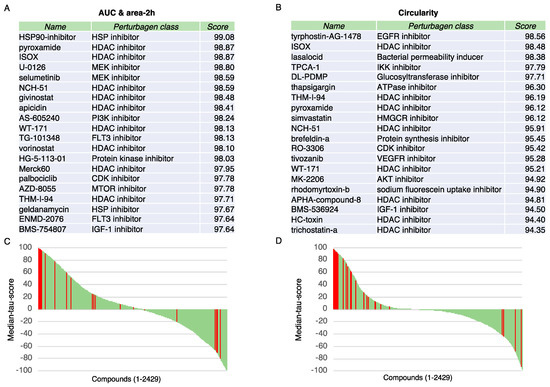 As the genes associated with area-2h and AUC were different from those associated with circularity, we could not identify putative regulators of tumor cell aggregation directly with the sparse PLS method. Therefore, we used the CMap resource [16] to compare the identified gene (Table S2) with the transcriptional signatures obtained after treatment of a variety of cell types with small-molecule compounds (n = 2429 perturbagens). The complete list of the median tau scores for the perturbagens is provided as Supplementary Materials (Table S3), and the perturbagens with the highest 20 top connectivity scores are listed in Figure 3 (top panels). Among the hundred molecules with the highest scores, HDAC inhibitors were the most represented inhibitor class in the analyses carried out with the genes associated with area-2h and AUC (Figure S2A) and with circularity (Figure S2B) (Figure 3, lower panels).