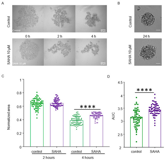 In the presence of SAHA, cells progressively aggregated (Figure 4A), without any obvious effect on spheroid formation at 24 h after seeding (Figure 4B). No cell death was visualized in the experimental condition used (data not shown). However, analysis of the relative area after 2 h and 4 h of aggregation and of the AUC (Figure 4C,D) from the aggregation curves showed that after 4 h, the relative area (mean value: 0.39 ± 0.06 vs. 0.47 ± 0.04; p < 0.0001) and the AUC (mean value: 3.12 ± 0.32 vs. 3.44 ± 0.21; p < 0.0001) were significantly higher in SAHA-treated cells than controls. We obtained similar results in cells incubated with ISOX (Figure S3). This indicates that the HDAC inhibitors SAHA and ISOX slightly, but significantly, inhibit the early steps of tumor cell aggregation, suggesting that these compounds could affect the cancer cell capacity to form clusters.
