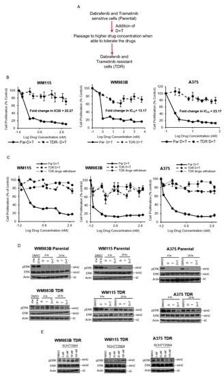 Growth kinetics of A375, A375 TDR, WM983B WM983B TDR, WM115, and WM115 TDR cells were determined by the 4,5-dimethylthiazol-2-yl)-2,5-diphenyltetrazolium bromide (MTT) assay. Briefly, 1 × 104 cells/well were seeded in 96-well plates in triplicates. For Figure 1B, a total of 10 concentrations of dabrafenib and trametinib were used in combination. The concentrations of dabrafenib and trametinib for WM115 were vehicle, 0.1 nM, 0.5 nM,1 nM, 5 nM, 10 nM, 50 nM, 100 nM, 500 nM, and 1 M. The concentrations of dabrafenib and trametinib for WM983B were vehicle, 0.5 nM, 1 nM, 5 nM, 10 nM, 50 nM, 100 nM, 500 nM, 1 M, and 5 M. The concentrations of dabrafenib and trametinib for A375 were vhicle, 0.1 nM, 0.5 nM, 1 nM, 5 nM, 10 nM, 50 nM, 100 nM, 500 nM, and 1 M. For Figure 1C, a total of 10 concentrations of dabrafenib and trametinib used were as follows: vehicle, 0.1 nM, 0.5 nM, 1 nM, 5 nM, 10 nM, 50 nM, 100 nM, 500 nM, and 1 M. After 72 h of treatment with dabrafenib and trametinib, the medium was substituted with 0.5 mg/mL MTT solution (Sigma Aldrich) for 4 h and absorbance was recorded at 570 nm using SPECTRAmax PLUS Microplate Spectrophotometer Plate Reader (Molecular Devices Corporation, San Jose, CA, USA) and expressed as the mean of triplicates relative to vehicle (DMSO) control together with standard error of mean (SEM). IC50 values were generated using the GraphPad Prism 7 software, version 7.01 (San Diego, CA, USA). In separate experiments, dabrafenib and trametinib were withdrawn from the TDR cells for 21 days and an MTT assay was performed with parental, TDR, and TDR cells with drugs withdrawn from them in the presence of dabrafenib and trametinib with the same conditions as mentioned above. Growth kinetics of TDR cells in the presence of 3, 5, and 10M BMS-754807 were assessed as mentioned above.