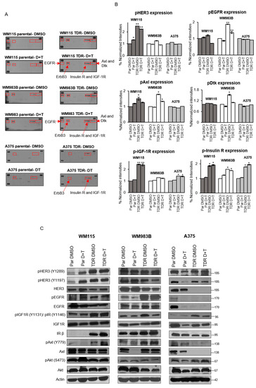 Parental and TDR cells treated with DMSO or a combination of dabrafenib and trametinib were lysed and 400 µg proteins were used for Proteome Profiler Human Phospho-RTK Array Kit (R&D Systems, cat#ARY001B(Minneapolis, MN, USA)) as per the manufacturer’s instructions. The intensities on the array were quantified using a negative control on the array and Image J software 1.8.0 (NIH) (Bethesda, MD, USA).
