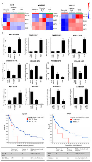 IGF1R and INSR are differentially expressed in TDR cells. (A) Heatmap of differentially expressed genes in parental cells, parental cells treated with combination of dabrafenib (D) and trametinib (T) (WM115: D: 800 nM, T: 200 nM; WM983B: D: 2.4 µM, T: 500 nM; A375: D: 250 nM, T: 12.5 nM), or TDR cells. (B) Quantification of Actin-normalized mRNA levels using real-time quantitative PCR for IGF1R, IGF1, IGF2, and INSR for parental cells treated with DMSO or dabrafenib + trametinib and TDR following 24 h of treatment. * p < 0.05; ** p < 0.01; *** p < 0.001; **** p < 0.0001 by two-tailed Student’s t-test. Data are presented as mean ± SEM. (C) Kaplan Meier survival curve of skin cutaneous melanoma patients (TCGA, PanCancer Atlas) with data stratified for BRAF mutation along with IGF1R expression z-score > 2 (n = 8) and IGF1R expression z-score < 2 (n = 179) (Left panel); and INSR expression z-score > 2 (n = 8) and INSR expression z-score < 2 (n = 181) (Right panel).