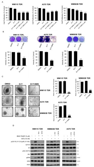 Three-dimensional (3D) growth assays were performed in growth factor-reduced matrigel (BD Biosciences, cat#CB-40230 (San Jose, CA, USA)) where 96-well plates were coated with 70 µL of matrigel/well. TDR cells (2 × 104/well) were plated and incubated at 37 °C for 24 h. Cells were treated with vehicle (DMSO), BMS-754807 (5 M) and/or dabrafenib + trametinib every alternate day. After 21 days of incubation, cells were visualized and photographs were captured from 5 random fields under microscope (Nikon, Melville, NY, USA) at 10× magnification. The areas of the cells were measured by ImageJ and represented as mean areas normalized to DMSO control.