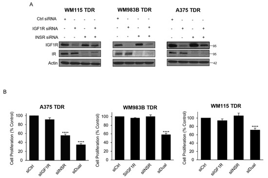 Dual knockdown of IGF1R and INSR reduces proliferation in TDR cells. (A) TDR cells were transfected with Ctrl siRNA, IGF1R siRNA, INSR siRNA, or combination of IGF1R and INSR siRNA for 72 h. Cells were collected, lysed, and analyzed for indicated antibodies. Actin was used as loading control. (B) TDR cells were transfected as described above, and plated and analyzed for MTT assay. **** p < 0.0001 by two-tailed Student’s t-test compared to siCtrl.