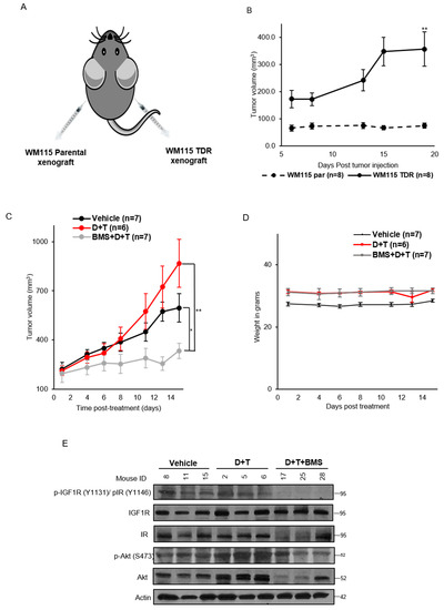 BMS-754807 inhibits tumor growth in WM115 TDR xenograft model. (A) Image of WM115 parental and TDR xenograft injection in nude mice. (B) Tumor growth kinetics of WM115 parental (n = 8) and TDR xenograft (n = 8) for 20 days post tumor injection. (C) Nude mice were injected with WM115 TDR cells and treated with vehicle, dabrafenib + trametinib (D + T), BMS-754807 (BMS), or the combination (BMS + D + T). Treatment was administered for 2 weeks by oral route. Tumors were measured thrice a week with calipers. Each data point represents the mean tumor volume ± SEM (n = 6–7). All data plotted as mean ± SEM. * p < 0.05, ** p < 0.005 calculated using Student’s t-test. (D) Mice weight was recorded post treatment with BMS-754807 in combination with dabrafenib and trametinib and represented. (E) p-IGF1R/p-IR and p-Akt expressions were assessed in the tumor lysate by Western blot. Actin served as loading control.