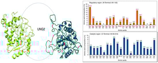 Intrinsically disordered proteins (IDPs) execute various functions in all kinds of cellular processes [64,65,66]. The N-terminal regulatory domain of UNG2 possesses such an unstructured regional IDP motif (AA 1–92). In general, the absence of a hydrophobic core is probably the reason for an unstructured region, whereby hydrophilic AAs may dominate in number. AAs have been classified as order-promoting (Asn, Cys, Ile, Leu, Phe, Trp, Tyr, and Val) and disorder-promoting (Ala, Arg, Gln, Glu, Gly, Lys, Pro, and Ser) [65,67]. The calculated AA composition revealed an abundance of disorder-promoting Ala, Pro, Ser, and Gly in the N-terminal regulatory region, which is very flexible in moving and orienting the N-terminus of UNG2. In contrast, the catalytic region is full of hydrophobic order-promoting AA residues, including Leu, Val, Ile, and Trp. Evidently, Cys and Trp are not available for a foldable secondary structure formation, as linker residues form in the N-terminus of the UNG2. The plot shows the biases in AA composition at N-terminal residues and explains the importance of sulfur-containing AAs and tryptophan at hydrophobic cores for protein rigidity. The absence of AAs, such as Cys and Trp, has been recognized by evolutionary studies about protein plasticity and disordered protein regions in previous studies (Figure 2) [66,68,69,70].