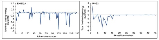 The molecular mechanics/generalized Born surface area (MM/GBSA) free energy decomposition per AA residue in protein–protein interactions was predicted on the FAM72A protein and UNG2 (AA 1–45) peptide heterodimer [45]. Hawkdock calculated the free binding energy for the key AA residues in the protein–protein interfaces based on the Amber16 force field [46].