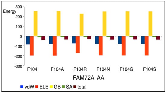 FWMF motif (AA 101–104)-specific mutation-dependent FAM72A protein and UNG2 (AA 1–45) peptide heterodimer free binding energy (energy in [kcal/mol]). FAM72A mutations at AA F104 phenylalanine (F104 → 104A, F104R, F104N, F104G, and F104S). A difference in total free binding energy was observed individually at the FWMF motif (AA 101–104)-specific mutations, with F104R mutation showing the highest effect on energy-dependent conformational change affecting FAM72A-UNG2 binding. The FAM72A protein and UNG2 (AA 1–45) peptide heterodimer free binding energy was calculated by the MM/GBSA approach. ELE, electrostatic; GB, polar accessible (a grid-based surface GB model is used for estimating the polar component of solvation free energy, coupled with water and atomic radii); SA, solvent area; total, sum of total energy; vdW, van der Waals; MM/GBSA, molecular mechanics/generalized Born surface area.