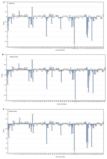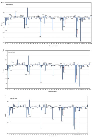 A site-specific mutagenic approach was enabled to check the hot spot residues in the FAM72A protein and UNG2 (AA 1–45) peptide heterodimer interaction. AA modifications in FAM72A (F104A, F104R, F104N, F104G, and F104S) and the effect on the conformational stability of the FAM72A protein and UNG2 (AA 1–45) peptide heterodimer complex were investigated by the BIOVIA Discovery Studio software (Dassault Systems; Waltham, MA, USA) as described previously [48,49].
