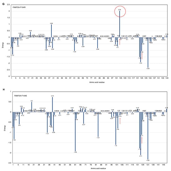 (A–H) FWMF motif (AA 101–104)-specific mutation-dependent FAM72A protein and UNG2 (AA 1–45) peptide heterodimer free binding energy. FAM72A mutations at AA F104 phenylalanine (F104 → F104A, F104R, F104N, F104G, and F104S). The essential AA residues in FAM72A-wt and UNG2 interaction are the 2, 37–40, 61, 83, 104, 123–126, and 131 AAs of FAM72A. The highest binding energy (kcal/mol) goes to FAM72A’s AA F104 within the FWMF motif (AA 101–104). Positive values indicate low binding energies and weak interactions, whereas more negative values indicate stronger interactions. Values around 0 indicate moderate interactions between FAM72A and UNG2. A change in the FWMF motif from wt F104 to F104R shows the largest effect, turning the binding energy from negative (−2.7; strong binding/hydrophobic core) to positive (+2.04; strong binding/hydrogen bonding).