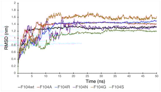 Since phenylalanine F104 appeared to be the key AA within the FWMF motif (AA 101–104) at the interface of the FAM72A-UNG2 interaction, we further investigated the effect of FAM72A mutations at wt AA F104 phenylalanine (F104 → F104A, F104R, F104N, F104G, and F104S) within the FWMF motif (AA 101–104) on the dynamic nature of FAM72A-UNG2 binding. Dynamic conformation changes in FAM72A-UNG2 (AA 1–45) binding were simulated by GROMACS and plotted by Grace (Figure 7, Figure 8 and Figure 9).