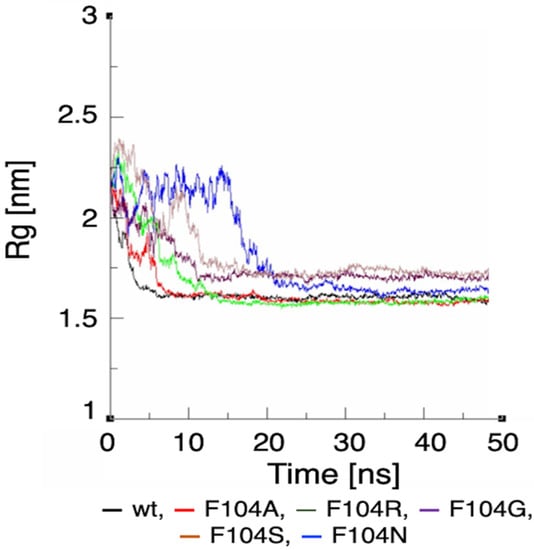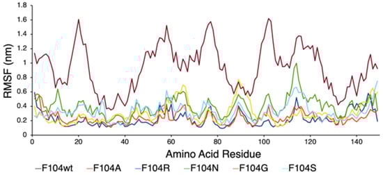 We assessed the effect of F104 mutations in FAM72A on the dynamic confirmation changes, stability, and rigidity of core and buried regions. Trajectories recorded up to 50 ns were plotted as RMSD, RMSF, and Rg, respectively. Figure 7, Figure 8 and Figure 9 show the effect of these mutations on protein backbone changes in mutated FAM72A and signifies the pivotal role of this FWMF motif (AA 101–104) for the FAM72A-UNG2 interaction. These data confirm the FWMF motif as a suitable target to interfere with FAM72A-UNG2 signaling pathways.