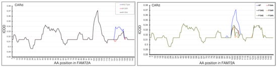 Internal carbon optimized domains (ICODs) of the FAM72Awt-UNG2 (AA 1–45) heterodimer confirmed the FAM72Awt-UNG2 (AA 1–45) interaction and the effect of the various FAM72A mutations on it, as carbon governs cohesiveness at the active site in proteins. Accordingly, ICODs of the FAM72Awt-UNG2 (AA 1–45) interaction validate a strong overlap of FAM72A-UNG2 binding. Particularly, mutations in FAM72A turn the ICODs of FAM72A at AAs 100–104 and 125–135 into non-ICODs, encouraging a less favorable and weaker FAM72Amut-UNG2 induced-fit-binding than that of FAM72Awt-UNG2. Based on CARd analysis, F104 tends to switch to F104R > F104S > F104N > F104G > F104A. The likelihood of the F104 (uuu) mutation to S104: ucu appears to be highest, as only one nucleotide would be changed compared with the others (F104R: cgu, F104N: aau, F104G: ggu, and F104A: gcu).