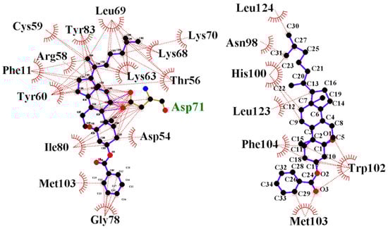 We performed a virtual high-throughput screening to detect a potential lead interference with the FAM72A-UNG2 interaction [71,72,73]. Binding scores, along with drug-likeness and pharmacophore properties, were considered [35,74,75,76,77,78]. The MTiOpen Screen required Autodock vina to exercise the docking of chemical libraries, scoring, and ensemble analysis [54,55]. The virtual screening suggested 100 compounds, and predicted binding energies (kcal/mol) were considered to filter the hits for the selection of the “best” hit for optimization in order to identify the promising lead compound. Based on predicted binding energies, we identified withaferin B (PubChem CID: 11113907) as the “best” hit (binding energy −0.5 kcal/mol) molecule that could potentially interfere with the FAM72A-UNG2 interaction (Figure 11). In the lead generation, the Glide XP docking analysis showed a strong binding affinity of −1.868 kcal/mol at the FAM72A-UNG2 interference site. Active AA residues contributing to the interaction were visualized by LIGPLOT (Figure 11).