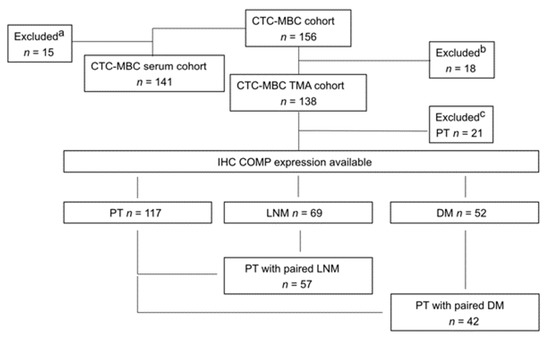 Flowchart of the study cohort. a Patient excluded due to lack of available serum samples. b Patients excluded due to lack of available tumor tissue. c Patients excluded due to lack of available primary tumor tissue for staining.