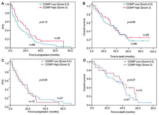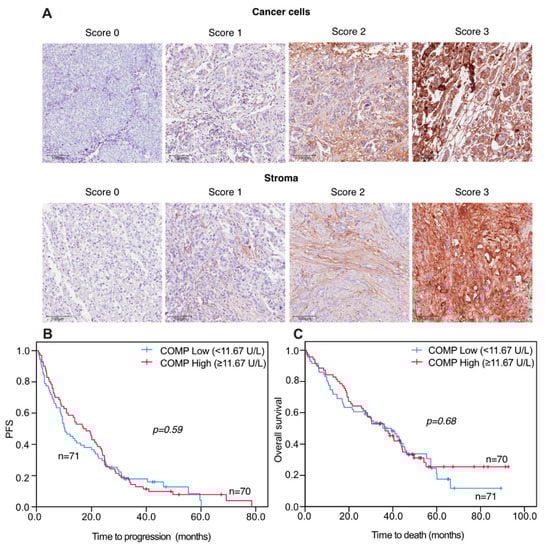 3.2. Progression-Free and Overall Survival in Correlation to S-COMP Levels