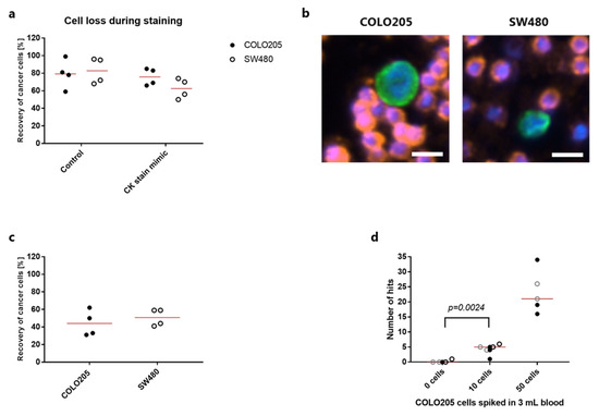 Our previously published data have shown an efficient capture of the COLO205 and SW480 colorectal cancer cell lines when spiked into 3 mL whole blood [15]. In that study, cells were prestained with CellTracker dye, enabling detection independently of staining procedure and marker expression. However, when adding a CK-based detection step downstream of the cell capture, the cancer cell recovery might decrease due to additional handling steps or inefficient CK staining. To assess the effect of the staining procedure, we prestained COLO205 and SW480 cells with CellTracker and spiked 100 cells into 3 mL blood. Following capture and fixation, half of the samples underwent a “CK stain mimic” procedure without any antibodies. The result showed a tendency of cell loss for SW480 cells upon application of the staining protocol from a mean recovery of 82.8% for control to 62.5% for stain mimic, while COLO205 cells seemed relatively unaffected (mean recovery of 79% for control and 76% for stain mimic) (Figure 1a).