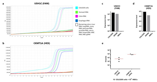 Validation of RNA markers for cancer cell detection. (a) Amplification curve showing the RT-qPCR reaction (one step) using primers and probes targeting USH1C (detected in the FAM channel). Samples tested include lysed COLO205 cells, RNA derived from a range of human tissues (explained in the color legend), and genomic DNA from white blood cells. All samples were tested in duplicates. (b) As in (a), but with primers and probes targeting CKMT1A (detected in the HEX channel). (c) Number of detected strands of USH1C cDNA from 1000 lysed COLO205 or SW480 cells measured by qPCR after RNA extraction, RT-PCR and pre-amplification. 100,000 WBCs were included in the procedure as a negative control. (d) As in (c), but showing the number of CKMT1A strands. (e) Number of cDNA strands of USH1C or CKMT1A detected from 10 COLO205 cells spiked in 100,000 white blood cells and directly lysed (n = 3). RNA was extracted and cDNA converted before being quantified by qPCR. Lines represent the mean.