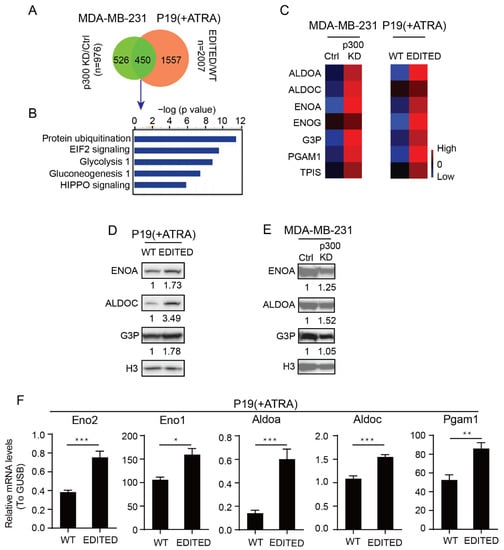 To begin our investigations on the differential roles of CBP and p300 in cellular metabolism, we performed proteomic analysis in two cell systems that we constructed, i.e., control versus p300 knockdown MDA-MB-231 (KD) cells (Figure S1B) and WT versus p300 edited (EDITED) P19 cells [30], treated with all-trans retinoic acid (ATRA). The P19 EDITED cells were generated by deletion of 9aa in exon 2 of p300, which plays a critical role in controlling crosstalk between the nuclear receptor family and the Wnt signaling cascade and the initiation of a feed-forward differentiation mechanism [30]. Of the 976 and 2007 differentially regulated proteins in the KD and EDITED cells, respectively, there were 450 overlapping differentially regulated proteins common to the two groups (Figure 1A). Interestingly, GO analysis of the overlapping proteins demonstrated that two of the top five were metabolic pathways, specifically, glycolysis and gluconeogenesis (Figure 1B). Despite the fact that MDA-MB-231 cells are triple negative breast cancer cells and even the wild type cells are highly glycolytic, proteins critical to glycolysis, including ALDOA, ENO1 and G3P, were all significantly upregulated in the p300 KD cells (Figure 1C). To further validate our proteomic analysis, we confirmed by immunoblotting, in both the KD and EDITED cells treated with ATRA, increased expression of these proteins critical for glycolysis (Figure 1D,E). P19 EDITED cells treated with ATRA also displayed significantly enhanced expression of the key glycolytic enzymes Aldoa, Aldoc, Eno1, Eno2 and Pgam1 compared to the wild type ATRA treated P19 cells, as judged by qPCR (Figure 1F. These results imply that reduction in p300 N-terminal functionality, either by decreasing the levels of p300 by knockdown or by editing critical highly evolutionarily conserved amino terminal residues that are divergent between CBP and p300, enhances the expression of key glycolytic enzymes.