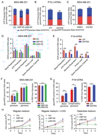 Dichotomous role of CBP and p300 in cellular metabolism and energetics. (A–C) Bar graph shows the proportion of ATP generated from mitochondrial OXPHOS or glycolysis, as determined by Seahorse ATP rate assay, in MDA-MB-231 control (Ctrl), CBP KD and p300 KD cells (A); in P19 WT and EDITED cells treated with ATRA (B); and in MDA-MB-231 control (Ctrl) and 10 µM ICG-001 treated cells (C). All significance testing was performed compared to control. (D) Bar graphs display details about mitochondrial respiratory capacities for MDA-MB-231 control (Ctrl), CBP KD and p300 KD cells. (E) Bar graphs show details regarding mitochondrial respiratory capacities for P19 WT and EDITED cells treated with ATRA. Glycolytic capacities are shown in bar graphs for MDA-MB-231 control (Ctrl), CBP KD and p300 KD cells (F), and P19 WT and EDITED cells treated with ATRA (G). (H) Cell growth rate assays for MDA-MB-231 control (Ctrl), CBP KD and p300 KD cells cultured in different media, including regular DMEM medium, DMEM with 2-DG and galactose medium. All significance tests were performed compared to control. * p < 0.05, ** p < 0.01, *** p < 0.001.