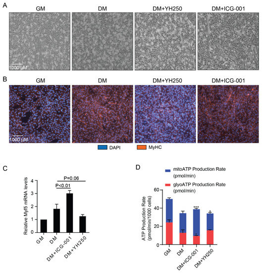 CBP and p300 differentially affect C2C12 differentiation and cellular energetics. (A) Cell morphology for C2C12 cells cultured in growth medium (GM), differentiation medium (DM), DM + YH250 (1 µM) and DM + ICG-001 (5 µM). Images were taken under 10× microscope. (B) Immunofluorescence staining for DAPI and MyHC examine the formation of C2C12 multi-nucleated myotubes and MyHC expression in growth medium (GM), differentiation medium (DM), DM + YH250 (1 µM) and DM + ICG-001 (5 µM). Images were taken under 10× fluorescence microscope. (C) Relative mRNA expression levels of the differentiation marker Myf5 were examined by qRT-PCR. (D) Seahorse ATP rate assay for C2C12 cells cultured in growth medium (GM), differentiation medium (DM), DM + YH250 (2 µM) and DM + ICG-001 (5 µM). All significance tests were performed by comparing to DM. * p < 0.05, *** p < 0.001.