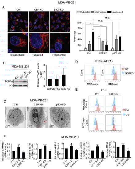Differential roles of CBP and p300 in mitochondrial biogenesis and activity. (A) Immunofluorescence staining for TOM20 in MDA-MB-231 cells (left panel) and quantification of the percent of cells containing tubulated, intermediate and fragmented mitochondria (right panel). At least 100 cells were quantified for each cell line. ** p < 0.01, n.s. not significant. (B) Expression of the mitochondrial membrane protein TOM20 was examined in MDA-MB-231 control (Ctrl), CBP KD and p300 KD cells. (C) Transmission electron micrographs of the ECM show mitochondrial morphology in MDA-MB-231 cells. Red arrows indicate elongated mitochondria in CBP KD cells. (D) Mitochondrial activity and mass were investigated by FACS utilizing MitoTracker Orange and MitoTracker Green in P19 WT and P19 p300 edited (EDITED) cells treated with ATRA. (E) P19 WT and P19p300 edited (EDITED) cells were cultured in Glucose (Glu) or Galactose (Gal) medium. The mitochondrial activity and mass were investigated via MitoTracker Orange and MitoTracker Green by FACS. (F) Relative mRNA expression levels were examined for mitochondria related genes, including SAMM50, TSPO, AARS2, HEBP2 and MFN2. * p < 0.05, ** p < 0.01, *** p < 0.001.
