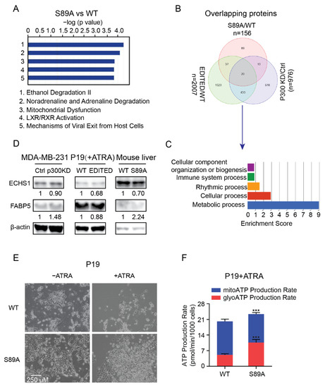 Our results above demonstrate that editing nine amino acids in the N-terminal region of p300 affects its ability to couple transcriptional regulation with differentiation and metabolic energetics. We have previously demonstrated the critical role that p300 serine 89 plays in adult progenitor cell differentiation [35]. To further explore this critical amino acid residue in the N-terminus of p300, we generated a S89A knockin point mutation in exon 2 of the EP300 gene in both the P19 cell line and in mice [39], via CRISPR/Cas9 gene editing and site-specific mutagenesis, respectively. This mutation removes the highly conserved phosphorylation site at the 89th amino acid of p300, which serves as an integration point for a number of signaling pathways, by changing from serine to alanine [33,34,36,39]. Gene ontology analysis of proteomic data from a number of tissues, including liver and intestine, from WT and S89A knockin mice indicated that mitochondrial dysfunction was one of the most enriched pathways (Figure 5A). Gene set enrichment analysis was performed on the 20 common differentially expressed proteins in MDA-MB-231 control vs. p300 KD cells, P19 WT vs. P19 EDITED cells and WT vs. S89A liver. Interestingly, by far the most enriched pathway was metabolic processes. Cellular processes, circadian rhythm, immune processes and biogenesis were also enriched (Figure 5B,C). To further confirm the changes observed by proteomic analysis, we examined the levels of 2 of the 20 commonly differentially expressed proteins, Enoyl-CoA Hydratase, Short Chain 1 (ECHS1) and Fatty Acid Binding Protein 5 (FABP5) in MDA-MB-231 control vs. p300 KD cells, P19 WT vs. P19 EDITED ATRA treated cells and WT vs. S89A liver by immunoblotting. ECHS1 functions in the second step of mitochondrial fatty acid beta-oxidation [56] and FABP5 is an intracellular carrier for long-chain fatty acids and can selectively deliver specific fatty acids from the cytosol to the nucleus, wherein they activate nuclear receptors [57,58]. Consistent with the proteomic analysis, differential expression of both ECHS1 and FABP5 was observed in all three systems (Figure 5D). As anticipated, based on our earlier results with the nine amino acid P19 EDITED cells [30], differentiation was dramatically inhibited in the P19 S89A mutated cells compared with the WT cells, as judged by cell morphology (Figure 5E). As previously discussed, differentiation needs to be coupled with metabolic remodeling. Consistent with this, Seahorse ATP assay indicated that the S89A mutation significantly affected the ratio of ATP generation from glycolysis and mitochondrial OXPHOS, with a significantly heavier reliance on glycolytic metabolism in the edited cells (Figure 5F). These results demonstrate that disturbing even this single amino acid in the N-terminal region of p300 dramatically interferes with cellular differentiation and transcriptional regulation of coordinated metabolic remodeling and enhanced mitochondrial OXPHOS, both in vitro and in vivo [35,38,39].