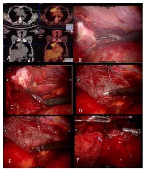 (A) Noncontrast CT of a myasthenia gravis patient with a thymoma and PET CT demonstrating FDG uptake. (B) Pericardial resection using the robotic bipolar instrument. (C) Invasion of pericardium may be deep in the left chest and may require upward traction up the pericardium. It is important to identify and preserve the left phrenic nerve from medial and internal side of the pericardium. (D) When reconstructing the pericardium with a graft, the first suture placed allows upward traction of the hilar pericardium. (E) A continuous suture technique with barbed sutures is preferred when reconstructing the pericardium. (F) As the left hilar pericardium is pulled up, attention should be given to not place the graft too tight as to constrict the heart.