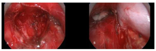 A patient with thymic carcinoma with suspicious mediastinal lymph node metastasis underwent cervical video mediastinoscopy and excision of the mediastinal lymph nodes. (A) Subcarinal region after complete removal of lymph node packet. (B) Right paratracheal region. The azygos vein and superior vena cava are seen skeletonized after lymphadenectomy.