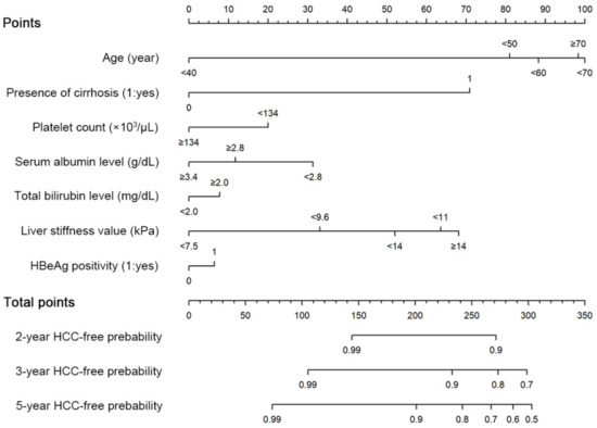Our study has several strengths. Firstly, our nomogram showed consistently superior c-index and TDAUC values for predicting HCC development during the long-term follow-up period, compared with that of other conventional risk prediction models, including the PAGE-B, mPAGE-B, and mREACH-B models, which showed high performance in previous literature [12,16,30]. Considering that cirrhosis itself alone can have potent discrimination power in predicting HCC risk with moderate prognostic performances, the performance of the nomogram in a subgroup with cirrhosis was slightly suboptimal. Nevertheless, owing to the adoption of other components, including liver stiffness, the overall predictive power could be significantly enhanced, showing their mutually complementary relationship. In addition, calibration plots of our nomogram indicated that the model provided unbiased result estimates. Moreover, the high performance of our nomogram was maintained in external validation. The PAGE-B and mPAGE-B models employed platelet counts and serum albumin levels to reflect the fibrotic burden of patients with chronic HBV infection on treatment with AVT. In contrast, our nomogram included key variables that more comprehensively cover an individual patient’s fibrotic burden (i.e., presence of cirrhosis, liver stiffness value, and platelet count), and the incorporation of serum albumin and bilirubin levels allow for the assessment of hepatic functional reserve related with the hepatic function of protein synthesis and detoxification. Such differences from the previous models may underlie the outstanding performance of our nomogram. Secondly, the large sample of >2000 patients who underwent baseline transient elastography with a long-term follow-up, as well as the sufficient number of HCC cases (n = 182, 8.9%) during the long-term follow-up period of approximately 60 months, allowed for statistical reliability and adequate power [18,31]. The higher HCC development during a follow-up period of 58.1 months may be derived from the higher prevalence of cirrhosis, compared to that shown in the study based upon a nationwide cohort (49.9% vs. 34.4%) [32]. Finally, in a similar context, the homogeneous distribution of our study population in terms of ethnicity, antiviral regimens (ETV or TDF), and HBV genotype C2 (>98%) might be another advantage. Therefore, our study results can be applied to real-world clinical settings, despite the retrospective study design.