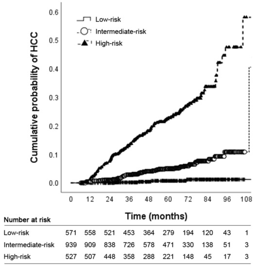 Risk stratification of HCC development according to novel nomogram scores (low-risk, score: ≤87; intermediate-risk, score: 88–222; high-risk: ≥223; p < 0.001 by log-rank test). HCC, hepatocellular carcinoma.