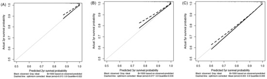Calibration plot of risk prediction model at 2 (A), 3 (B), and 5 years (C) after initiation of antiviral therapy.