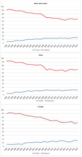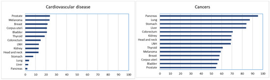 Cancer and cardiovascular diseases are leading global causes of death [1]. In Italy, 170,730 deaths from cancer (men, 94,683; women, 76,047) and 220,456 deaths from cardiovascular diseases (CVD) (men, 96,017; women, 124,439) were recorded in 2018 [2].