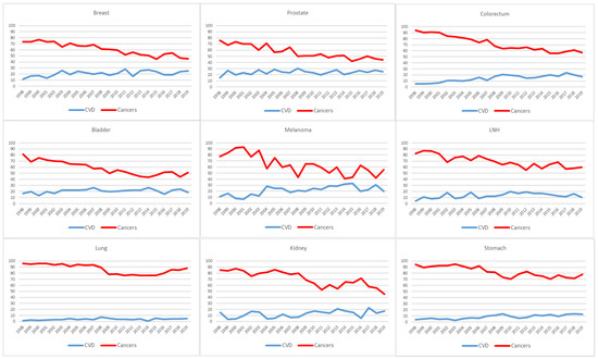 Regarding tumor site, there were few deaths from CVD in patients with breast, prostate, and colorectal cancers in 1996–1999; the number increased to about 50 cases (per single tumor site) recorded in 2015–2019. There was an increase in cardiovascular mortality in melanoma and kidney cancer patients starting from 2015, and a slight gradual increase for lung cancer patients over the 25 years, although this remained very limited. The trend of cardiovascular mortality increased for breast, prostate, colon, melanoma, and stomach cancers, and for non-Hodgkin’s lymphoma, and decreased for bladder, lung, and kidney cancers (Figure 4).