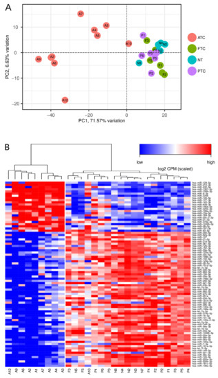 Unsupervised analyses of small RNA expression data from 10 ATCs, 6 PTCs, 6 FTCs, and 6 nonmalignant human thyroid (NT, normal thyroid) samples of 85 miRNAs with significantly deregulated expression (DE) in ATC. (A) Principal component analysis (PCA) shows that DE miRNAs distinguish ATC from all other samples analyzed, except for ATC#10. (B) Hierarchical clustering of the 85 significantly deregulated miRNAs supports the PCA analyses and sharply distinguishes all ATC samples, except ATC#10. Rows are ordered by average log2 fold change of miRNA expression in ATC samples compared to all other samples analyzed. Normalized log2 CPM (counts per million mapped reads) expression values of identified miRNAs were used for both analyses.