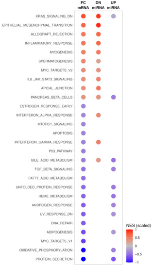 Gene Set Enrichment Analysis (GSEA) of total and miRNA-dependent differential mRNA expression in ATC. Columns indicate GSEA results using distinct mRNA selection: FC mRNA, all expressed mRNAs were ranked by their log fold change of expression in ATC compared to all other samples; DN miRNA, candidate target mRNAs with positive interaction scores (IS) determined for DN-miRNAs were ranked by their log fold change of expression in ATC compared to all other samples; UP miRNA candidate target mRNAs with positive interaction scores (IS) determined for UP-miRNAs also ranked by their log fold change of expression in ATC. Color coding indicates scaled normalized enrichment scores (NES) determined for indicated hallmark gene sets. NES scale bar is indicated.