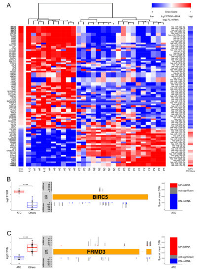 High ranking miRNA–mRNA interactions identify miRNA-dependent regulation of oncogenic and tumor-suppressive factors in ATC. (A) Hierarchical clustering of the top scoring (IS = 1) target mRNAs of the 85 DE miRNAs sharply distinguish all ATC samples. Samples were ordered by the scaled OncoScore (OS), indicating the oncogenic (top score 1) vs. tumor-suppressive (top score −1) potential of the respective genes. Gene symbols are indicated in the left panel. Log2 transformed FPKM expression values of indicated mRNAs scaled to low and high expression range [−1, 1] are depicted by a heatmap in the middle panel. Prime targeting miRNAs of indicated mRNAs are indicated in the right panel along with the scaled [−1, 1] fold change of miRNA expression in ATC vs. others. (B,C) Expression and miRNA targeting of the prime oncogene upregulated by miRNA downregulation (BIRC5, (B)) and the prime tumor-suppressor candidate decreased by miRNA upregulation (FRMD3, (C)). Boxplots (left panels) show BIRC5 and FRMD3 mRNA (log2 FPKM) expression in ATC and others; **** p < 0.0001. Schemes (middle panels) depict the meta 3′-UTR of selected genes with predicted binding sites for targeting miRNAs with average expression >100 CPM. Fold change of miRNA expression is indicated by up/down bars scaled by fold change of expression. Color coding indicates significant deregulation (FDR < 0.01). Nonsignificant in grey. The sum CPM of targeting miRNAs sorted by significant (color coded) or insignificant change of expression (grey) is indicated in the right panels.