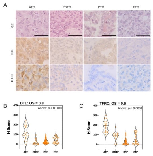 Aiming to rule out that the analyses are potentially biased by evaluating only miRNA/mRNA data derived from a small and unique cohort, the protein expression of two additional candidate oncogenic factors was investigated in an independent cohort. To this end, the protein expression of DTL (denticleless protein homolog) and TFRC (transferrin receptor), both suggested to be upregulated by miRNA downregulation, was analyzed in an independent thyroid carcinoma tumor cohort (n = 151) by immunohistochemistry. Similar to recent findings reporting the de novo synthesis of IGF2BP1 in ATC [8], these studies confirmed a strong upregulation of both proteins in ATC (Figure 5). Strikingly, the H-scoring of DTL as well as the TFRC protein expression demonstrated a sharp upregulation of both factors in ATC (Figure 5B,C; Table S8). Their upregulation even allowed a clear distinction of ATCs (n = 20) from PDTCs (n = 18), confirming that the presented analysis pipeline is unlikely biased by the small size of the test cohort.