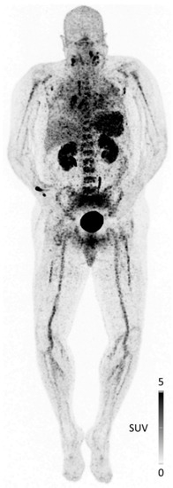 - Lapa, C.; Schirbel, A.; Samnick, S.; Luckerath, K.; Kortum, K.M.; Knop, S.; Wester, H.J.; Buck, A.K.; Schreder, M. The Gross Picture: Intraindividual Tumour Heterogeneity in a Patient with Nonsecretory Multiple Myeloma. Eur. J. Nucl. Med. Mol. Imaging 2017, 44, 1097–1098. [Google Scholar] [CrossRef]