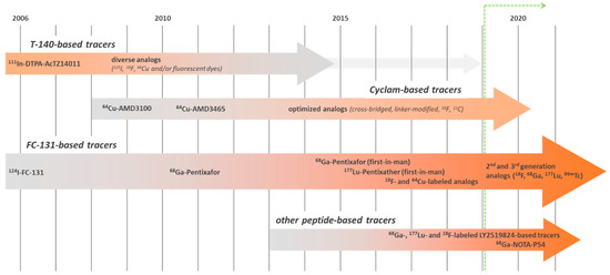 Historical evolution and relevance of the development of CXCR4-targeted imaging probes based on different chemical scaffolds (green line indicates the timeframe covered in this review).