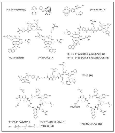 - Liu, N.; Wan, Q.; Cheng, Z.; Chen, Y. Radionuclide-Labeled Peptides for Imaging and Treatment of CXCR4- Overexpressing Malignant Tumors. Curr. Top. Med. Chem. 2019, 19, 17–32. [Google Scholar] [CrossRef] [PubMed]